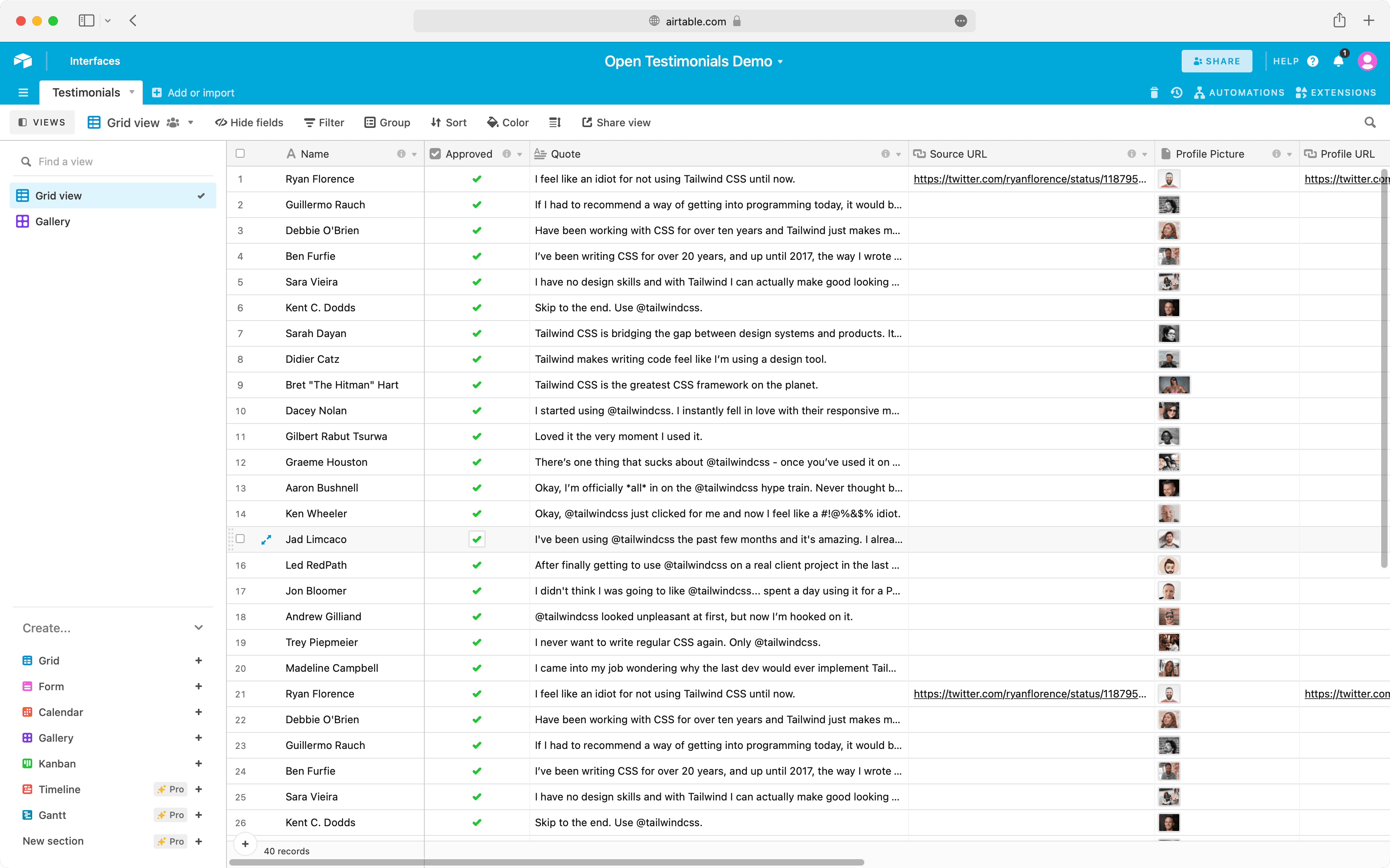 Keep track of your customer testimonials using Airtable. Use familiar tools that already fit into your workflow.